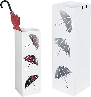 Ce porte-parapluies est doté d'un bac anti-égouttement en plastique, pour recueillir les gouttes d'eau et protéger le sol. Il est également doté de crochets internes pour suspendre les parapluies pliants et de patins antidérapants. Les matériaux utilisés et les finitions font de ce porte-parapluie un objet design haut de gamme, conçu pour tous les appartements au style affirmé. Superbe porte-parapluies design, minimaliste et moderne avec incrustations en forme de parapluies et de gouttes de pluie, il trouve facilement sa place dans un salon, un couloir, un bureau ou partout où vous voulez car il s'adapte parfaitement à tout type d'ameublement. Fabriqué en métal de haute qualité, couleur blanche, avec finitions et revêtement par poudre résistant à la corrosion. Peut être utilisé pour les parapluies, les bâtons de marche et les valves. Ce porte-parapluies